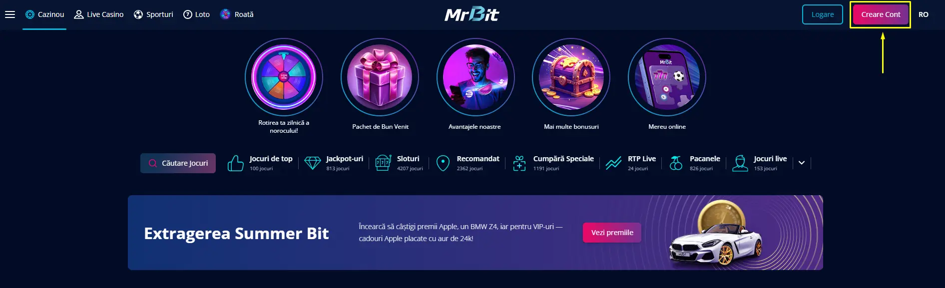 Deschide-ți un cont nou de jucător, dacă nu ai unul deja. Accesează site-ul oficial Mr Bit și apasă pe butonul “Creare Cont”.