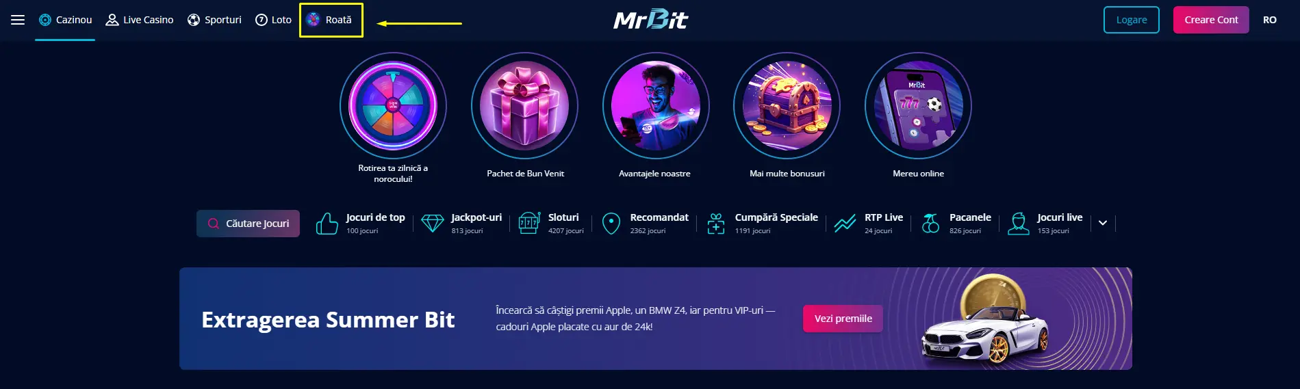 În calitate de client înregistrat al site-ului, poți învârti uimitoarea roată o dată pe zi, până la sfârșitul promoției. Explorează cu încredere platforma și găsește secțiunea dedicată Roții Norocului pentru a te bucura de primele tale bonusuri Mr Bit.