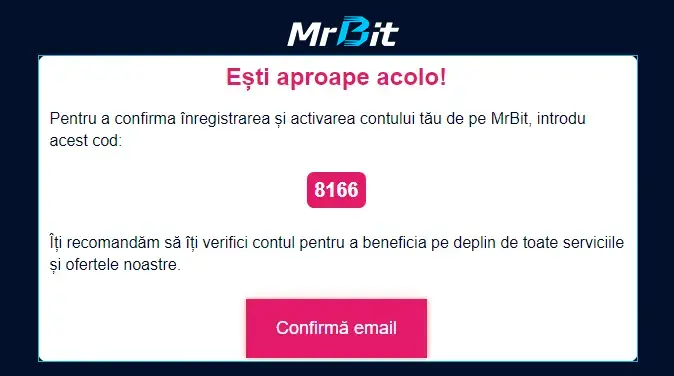 Operatorul îți va trimite un e-mail cu un cod de activare. De asemenea, acesta va conține și un link cu titlul “Confirmă email”. Respectă instrucțiunile și termină cu procesul de înregistrare la Mr Bit.