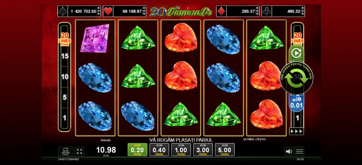 Pentru a începe să joci 20 Diamonds, folosește butoanele intuitive de pe interfața jocului pentru a ajusta mizele și a controla rotirile. Poți seta miza dorită prin butoanele “+” și “-” situate în partea inferioară a ecranului.