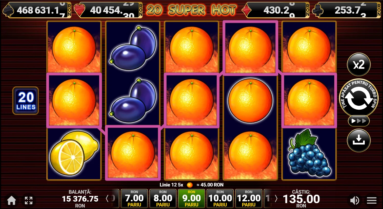 Pentru fanii sloturilor clasice, EGT, care acum se numește Amusnet Interactive, a lansat seria Super Hot. Acest slot video este un vis retro pentru jucătorii care se bucură de mai multe linii de plată, dar care își doresc totuși o temă familiară. Fundalul este un amestec de nuanțe întunecate, care contrastează cu simbolurile strălucitoare.